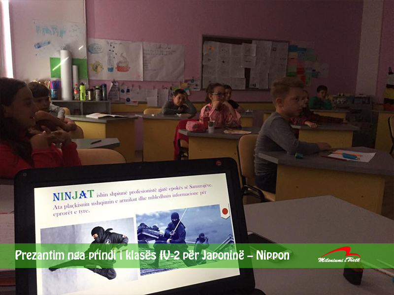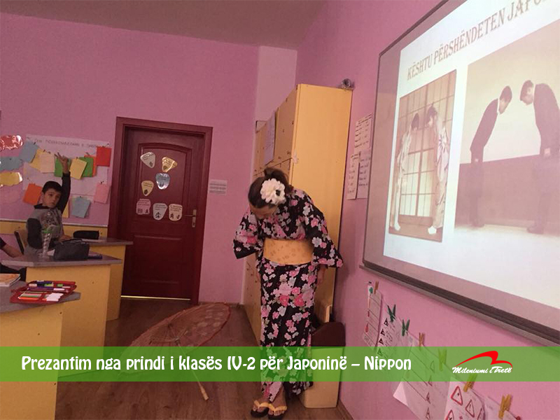 Informata të shumta dhe të rëndësishme për Japoninë solli në klasën tonë prindi i klasës znj. Ermira Hatipi, e veshur me kimono dhe detaje të tjera të veshjes tradicionale japoneze, të cilat mahnitën nxënësit. Ishulli i Japonisë gjendet në kontinentin e Azisë. Japonezët e quajnë Nippon, që do të thotë Origjina e Diellit, dhe për kryeqytet ka Tokyo-n. Monedha e tyre quhet Yen. Me kureshtje të madhe nxënësit dëgjuan prezantimin e përgatitur nga znj. Ermira, e cila për rreth 40 minuta me shumë dashuri shpjegoi rrugëtimin e saj që kishte përjetuar në Japoni.  Nxënësit mësuan detaje edhe për tempujt, portat, pagodat, objekte për praktika fetare, sportet japoneze, ushqimin dhe artin japonez. Prezantimi  për Japoninë ishte njëri ndër më mbresëlënësit për nxënësit e klasës. Falënderim të madh nga zemra për znj. Ermira Hatipi nga klasa IV-2.