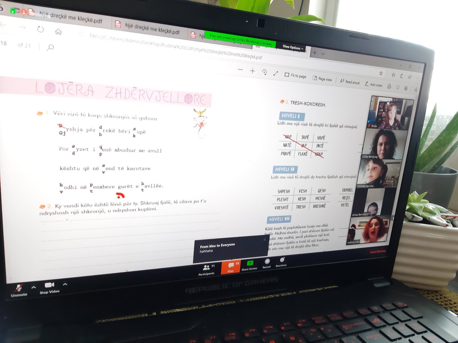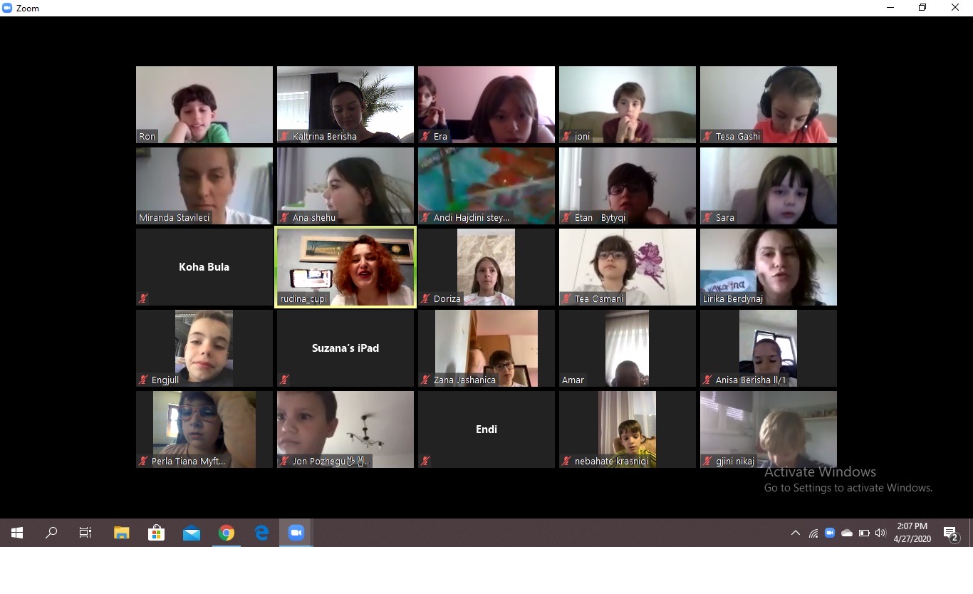 (Rudina Çupi në Zoom me 70 nxënës të klasave të dyta) Sot dita e parë e javës së projekteve pati për ne shumë disponim dhe energji të re, falë poetes Rudina Çupi. Zonja Rudina iu bashkua nxënësve tanë me prezantimin e librit “Një dreçkë me kleçkë”. Në fund të bashkëpunimit, të gjithë u bashkuan edhe për një lojë mjaftë atraktive, që ishte si shpërblim për një bashkëpunim të shkëlqyeshëm. Ne e falenderojmë shumë zonjën Rudina dhe urojmë që të na bashkohet sërish në të ardhmen.